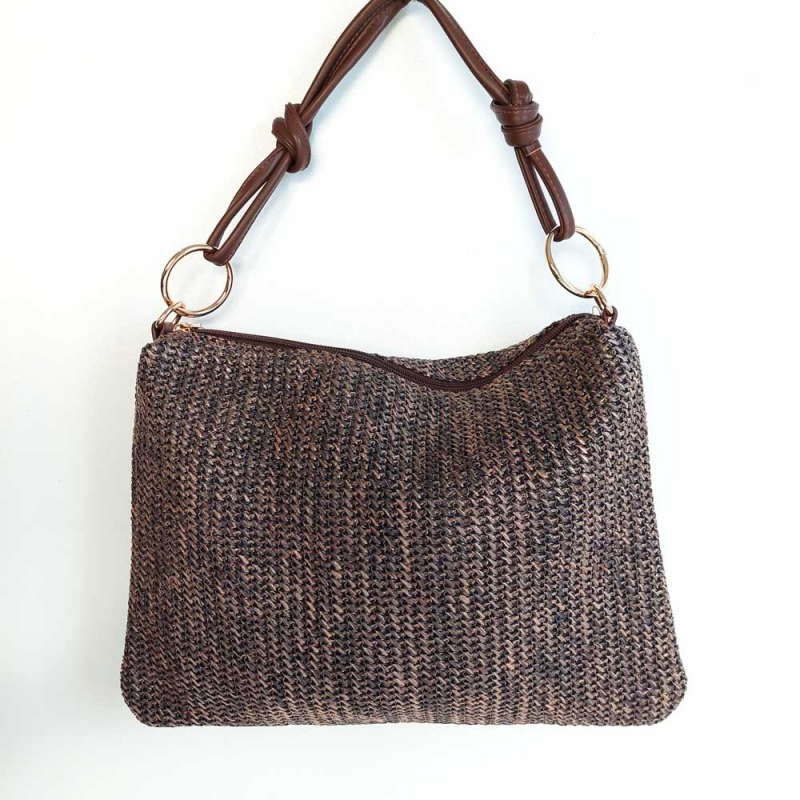 Ein lässige dunkelbraun melierte kleine Handtasche. Oben wird die Tasche mit einem Reißverschluss geschlossen. Die goldene Ringe an den Seiten geben der Tasche eine coolen Look, genau wie der geknotete Taschenhenkel aus Lederimitat. Außen hat die Tasche auf der Rückseite eine Reißverschlusstasche.