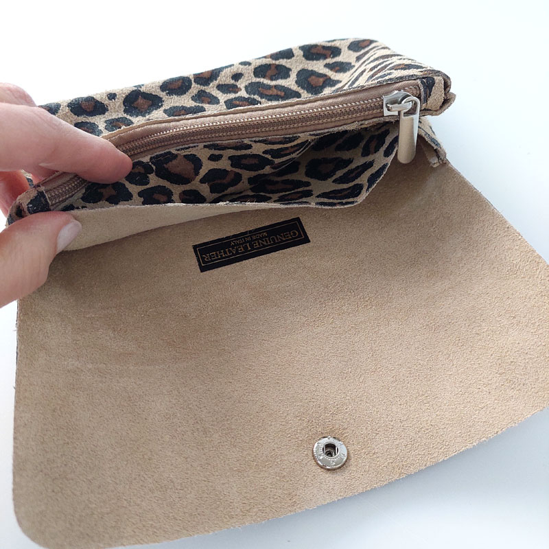 Die Tasche wird oben mit einem goldenen Reißverschluss geschlossen und verfügt über ein praktisches Innenfach mit Zipper, in dem Sie Smartphone, Schlüssel oder Make-up sicher verstauen können. Dank des schmalen Schulterriemens tragen Sie sie bequem als Crossbody Tasche oder klassisch über der Schulter. Entfernen Sie den Riemen, verwandelt sich die Tasche im Handumdrehen in eine elegante Wildleder Clutch, die sich perfekt für Abend-Events oder einen stilvollen Auftritt im Alltag eignet.