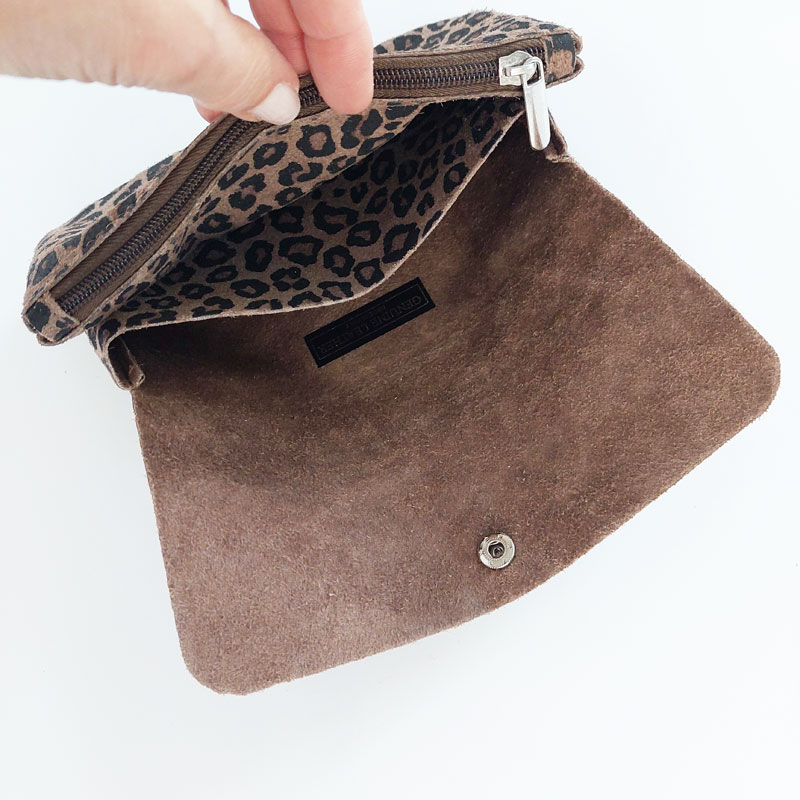 Die Tasche wird oben mit einem goldenen Reißverschluss geschlossen und verfügt über ein praktisches Innenfach mit Zipper, in dem Sie Smartphone, Schlüssel oder Make-up sicher verstauen können. Dank des schmalen Schulterriemens tragen Sie sie bequem als Crossbody Tasche oder klassisch über der Schulter. Entfernen Sie den Riemen, verwandelt sich die Tasche im Handumdrehen in eine elegante Wildleder Clutch, die sich perfekt für Abend-Events oder einen stilvollen Auftritt im Alltag eignet.