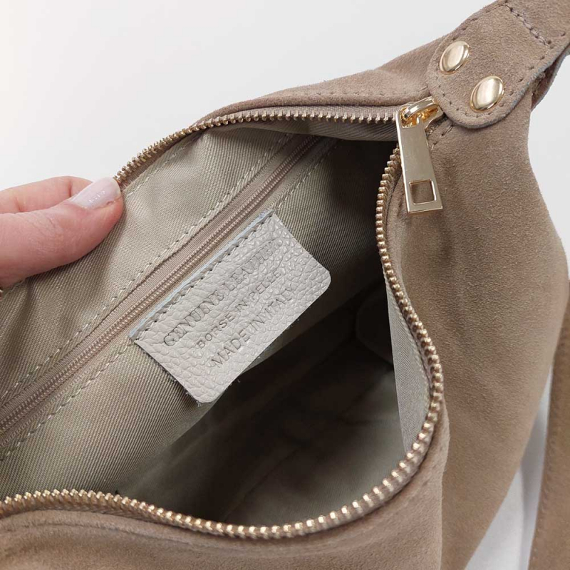 Setzen Sie auf Qualität, Stil und Tradition – entscheiden Sie sich für unsere schicke Handtasche aus Wildleder, Made in Italy.
