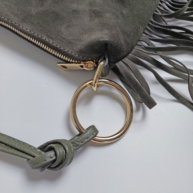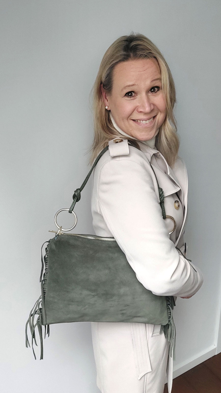 Setzen Sie auf italienischen Stil und zeitlose Eleganz – mit dieser schicken Tasche aus echtem Wildleder in edlem Armygrün. Die schlichte Form wird stilvoll durch markante goldene Metallringe ergänzt, die dem Design einen modernen & coolen Look verleihen. Die Tasche kann mir dem kurzen Lederriemen über die Schulter getragen werden oder mit dem langen Schulterriemen auch quer über die Schulter.
