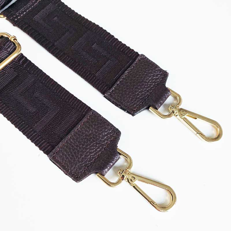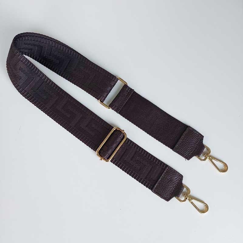 Ein dunkelbrauner Taschengurt mit strukturierter Oberfläche in From eines grafischen Labyrinthmusters. Die Lederenden sind dunkelbraun. Die Schnallen und Karabinerhaken sind goldfarbig. Die Rückseite ist glatt und ohne Muster.