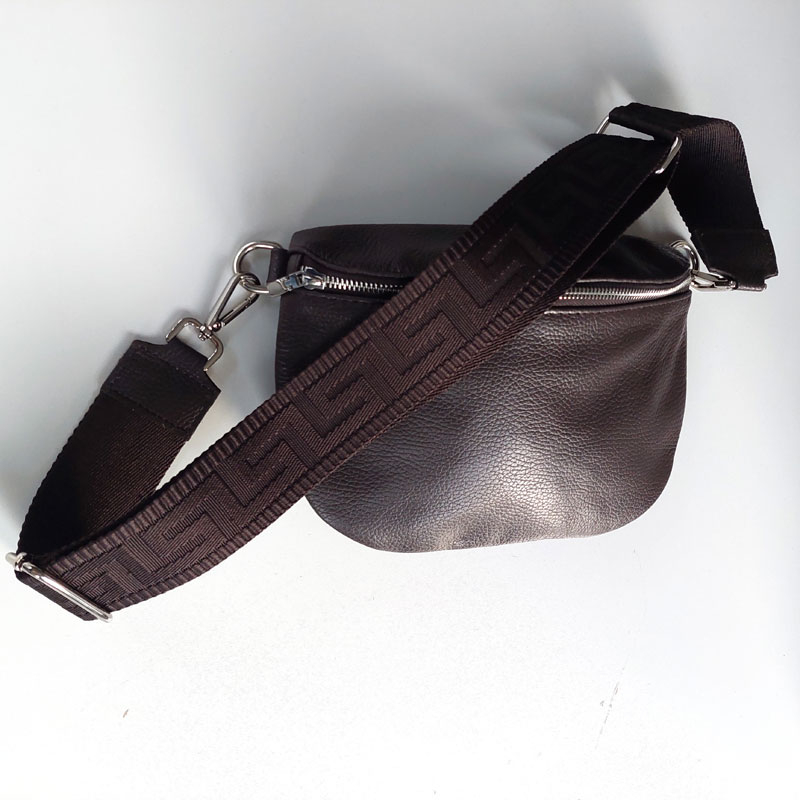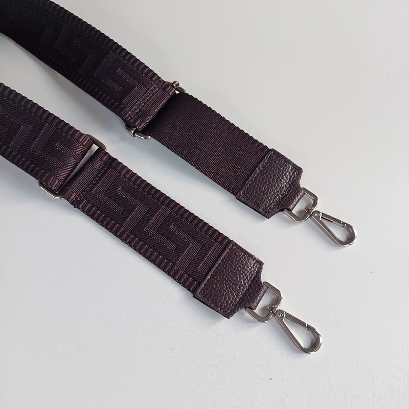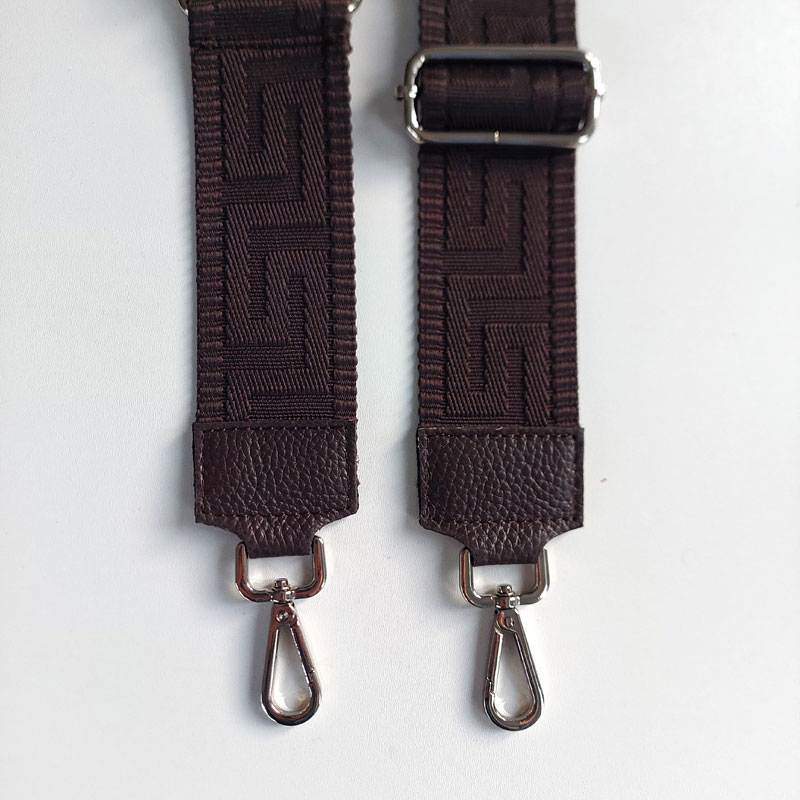 Ein dunkelbrauner Taschengurt mit strukturierter Oberfläche in From eines grafischen Labyrinthmusters. Die Lederenden sind dunkelbraun. Die Schnallen und Karabinerhaken sind silberfarbig. Die Rückseite ist glatt und ohne Muster.