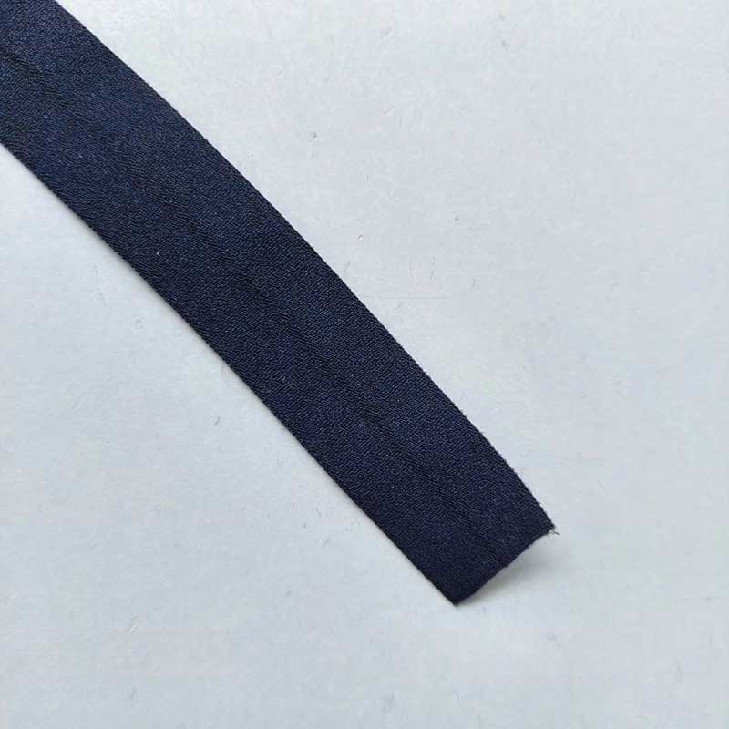 Ein elastisches, dunkelblaues Falzband. Das einfarbige Gummiband ist weich im Griff mit einer matten Oberfläche. Es ist 2 cm breit und wird beim Annähen umgefalzt, so dass es dann nur noch 1 cm breit ist.