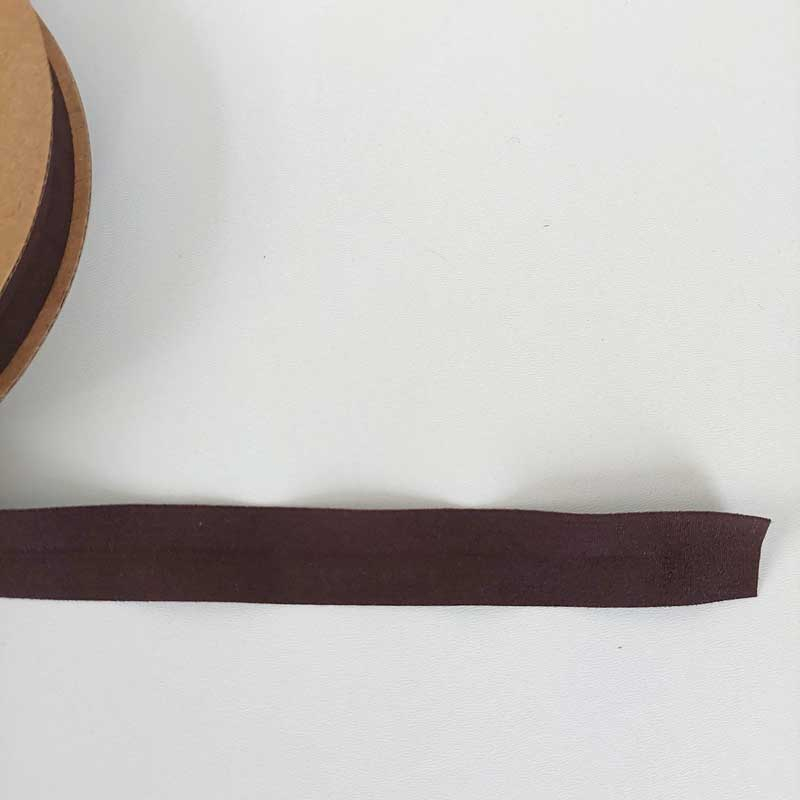 Ein elastisches, dunkelbraunes Falzband. Das einfarbige Gummiband ist weich im Griff mit einer matten Oberfläche. Es ist 2 cm breit und wird beim Annähen umgefalzt, so dass es dann nur noch 1 cm breit ist.