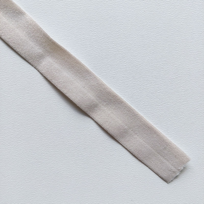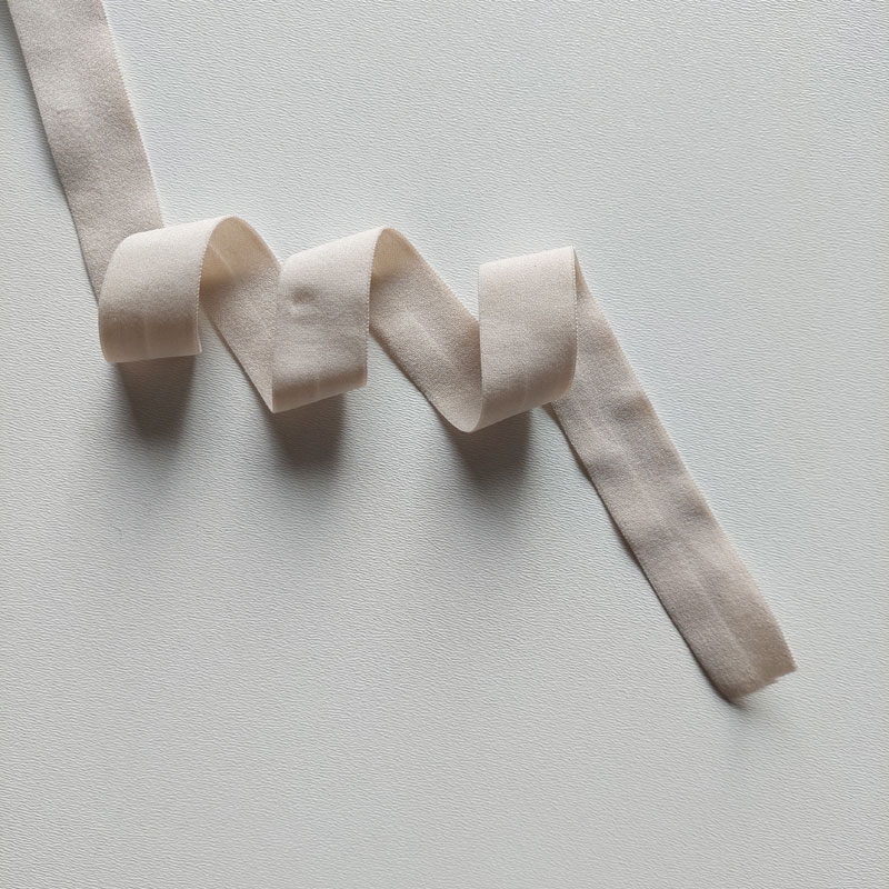 Ein elastisches, hellbeiges Falzband. Das einfarbige Gummiband ist weich im Griff mit einer matten Oberfläche. Es ist 2 cm breit und wird beim Annähen umgefalzt, so dass es dann nur noch 1 cm breit ist.