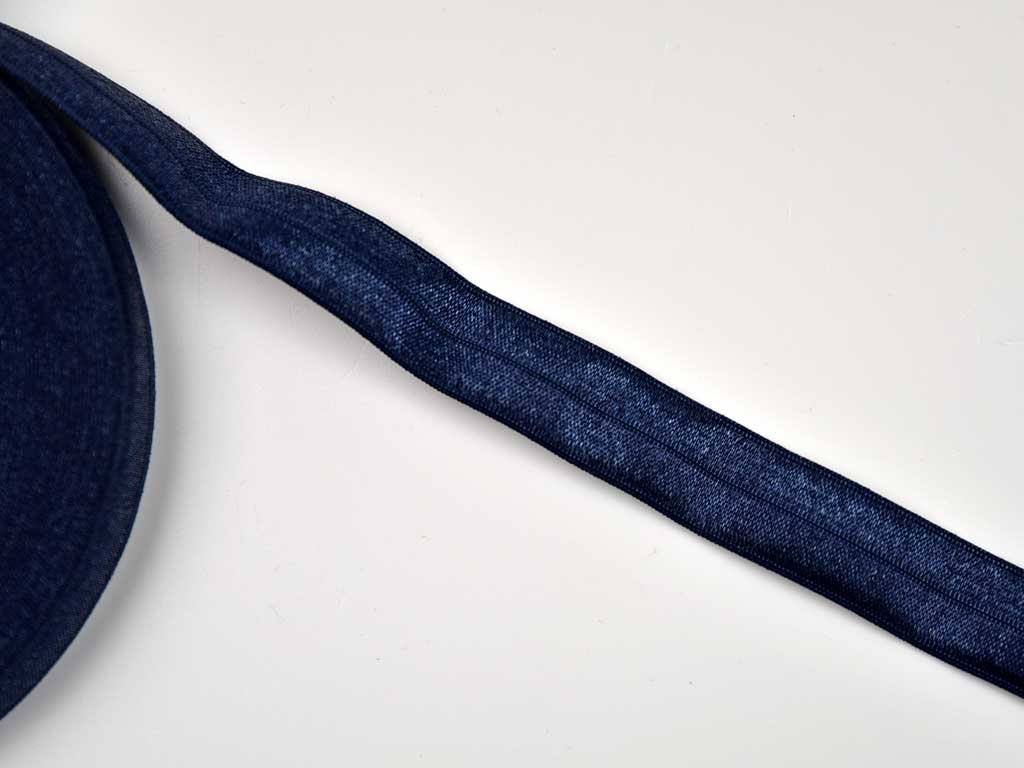 Ein elastisches 1,8 cm breites, dunkelblaues Falzband. In der Mitte gefalzt, zum leichten Umklappen beim Annähen. Zusammengeklappt und angenäht ist es dann nur noch 0,9 cm breit. Leicht glänzende Oberfläche.