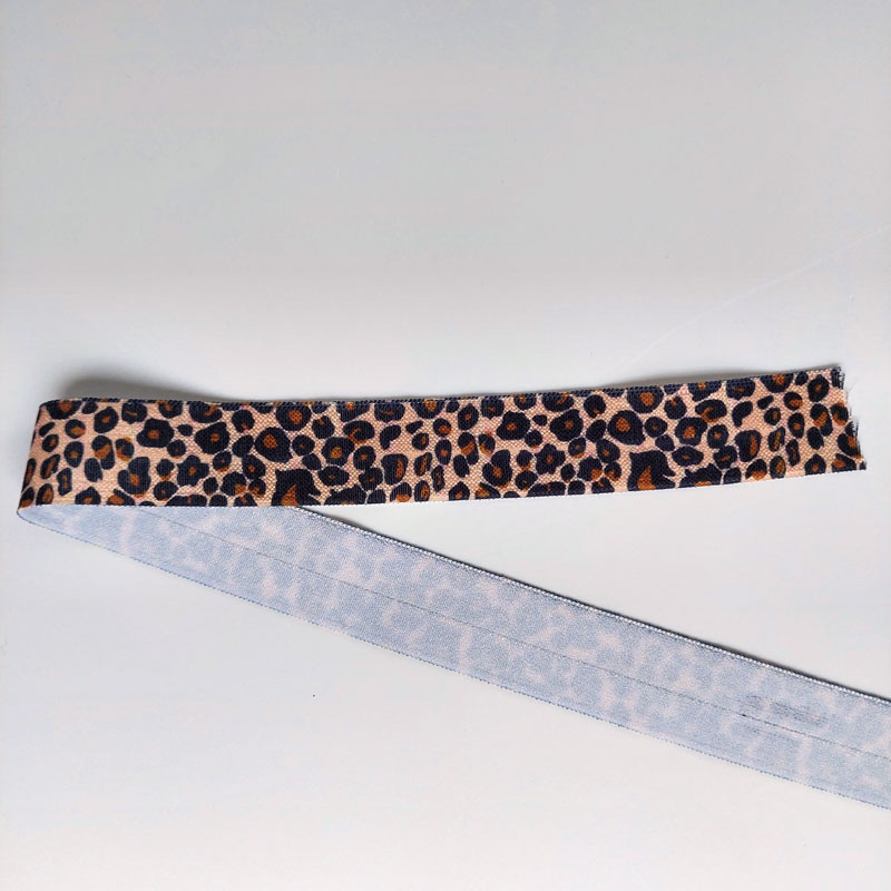 Ein beiges Falzgummi bedruckt mit schwarz braunem Leopardenmuster. Das elastische Nahtband ist 2,3 cm breit und in der Mitte vorgefalzt, zum leichten Umklappen beim Annähen. Zusammengeklappt und angenäht ist es dann nur noch 1,1 cm breit. Das Gummiband hat eine leicht glänzende, glatte Oberfläche, auf der Rückseite ist es weiß.