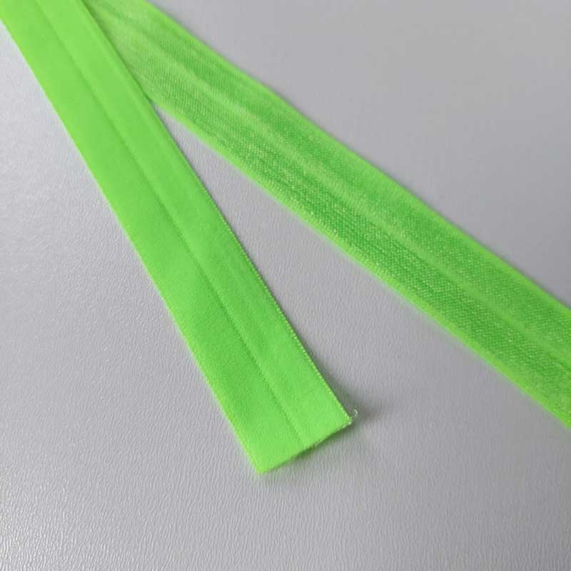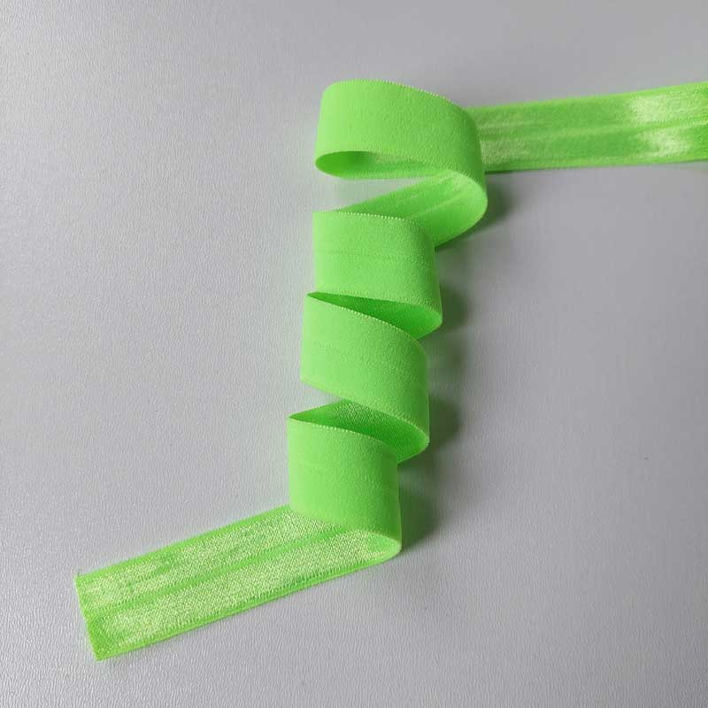 Ein neongrünes Falzgummi. Das elastische Nahtband ist 1,8 cm breit und in der Mitte vorgefalzt, zum leichten Umklappen beim Annähen. Zusammengeklappt und angenäht ist es dann nur noch 0,9 cm breit. Das Gummiband hat eine leicht glänzende, glatte Oberfläche, auf der Rückseite ist es matt. Je nach Belieben kann entweder die glänzende oder matte Seite verwendet werden.