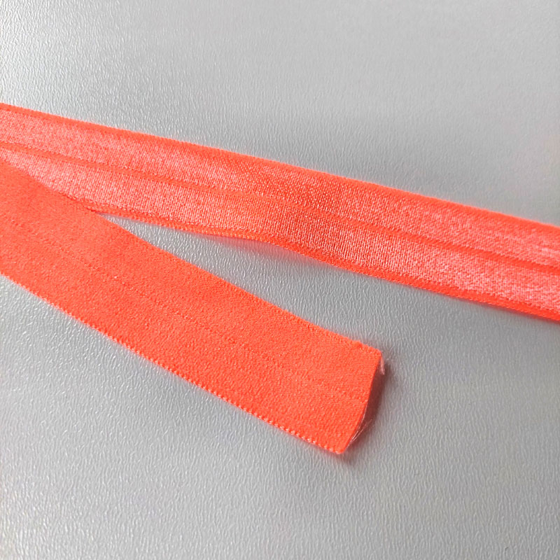 Ein neonorange Falzgummi. Das elastische Nahtband ist 1,8 cm breit und in der Mitte vorgefalzt, zum leichten Umklappen beim Annähen. Zusammengeklappt und angenäht ist es dann nur noch 0,9 cm breit. Das Gummiband hat eine leicht glänzende, glatte Oberfläche, auf der Rückseite ist es matt. Je nach Belieben kann entweder die glänzende oder matte Seite verwendet werden.