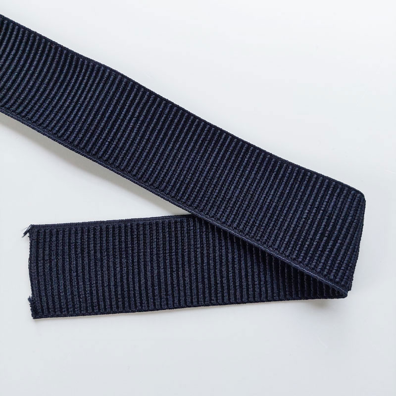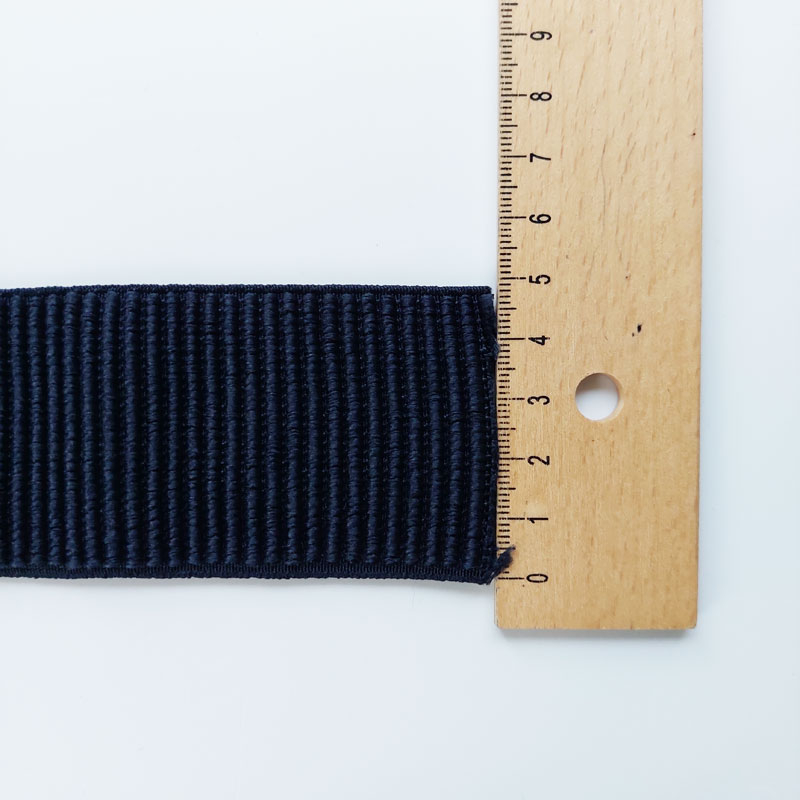Ein dunkelblaues, geripptes Gummiband in 5 cm Breite. Das Band ist gut elastisch und hat einen weichen Griff.