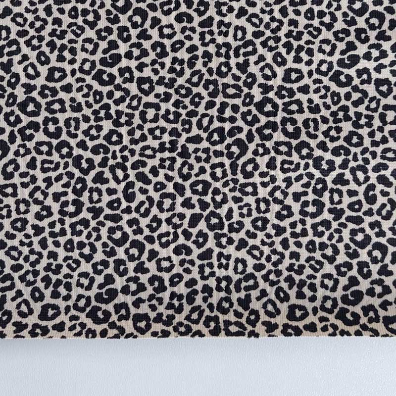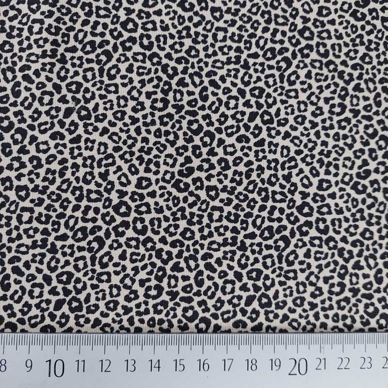 Ein beiger Jerseystoff aus Baumwolle bedruckt mit kleinem schwarzen Leopardenmuster. Diese Farbkombination gibt dem Stoff extra Coolness und macht den Stoff zu etwas ganz Besonderem.