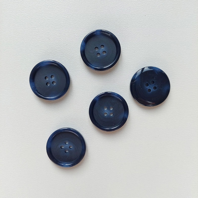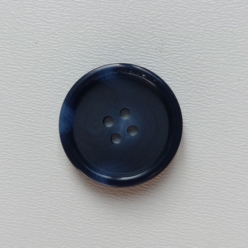 Ein dunkelblauer, runder Knopf mit 4 Löchern zum Annähen. Der Knopf hat einen Durchmesser von 30 mm (Knopfgröße 48). Der Knopf hat an manchen Stellen einen leicht marmorierten Farbeffekt in einem helleren Blau.