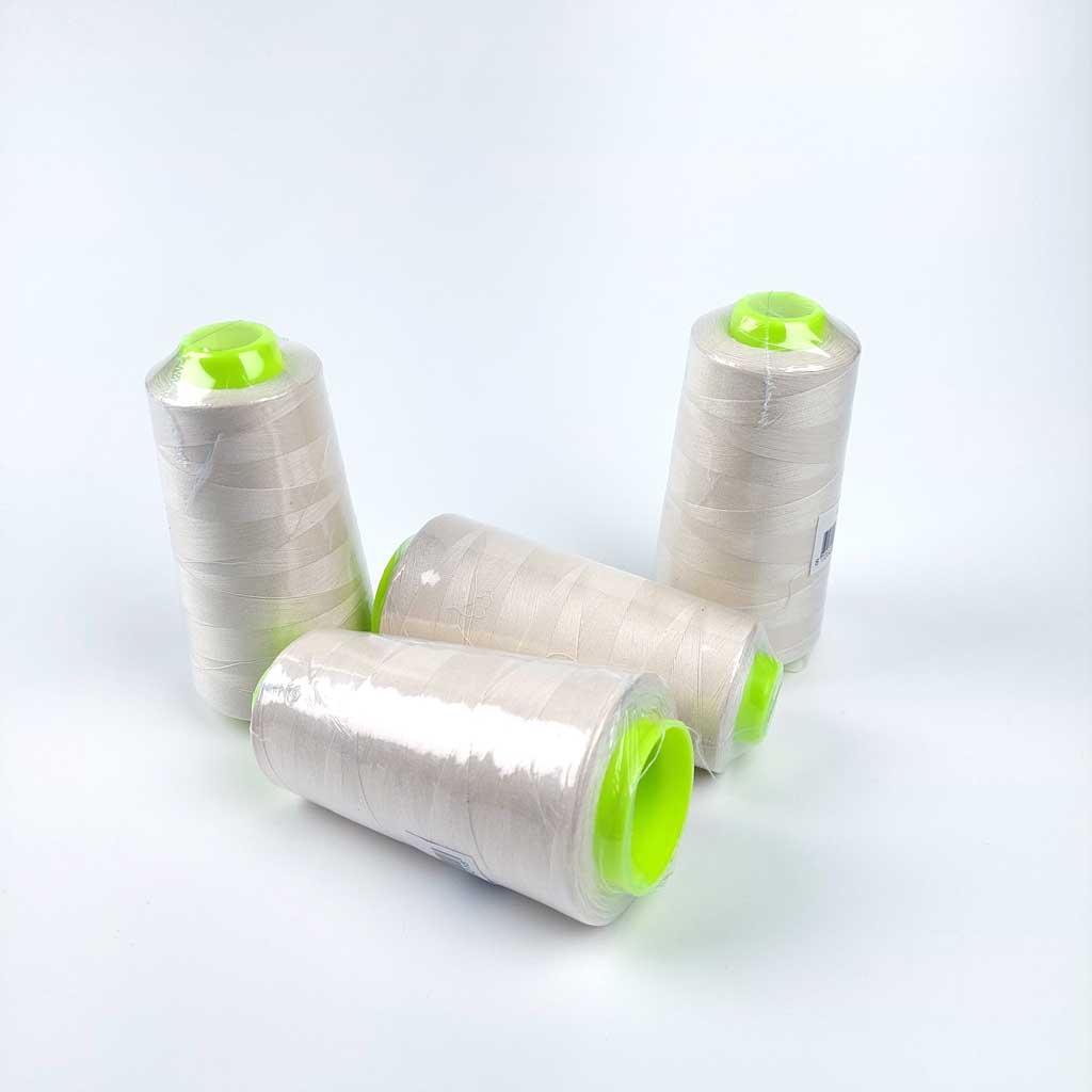 4 Rollen hochwertiges, cremeweißes Overlockgarn, das ebenfalls als Nähgarn verwendet werden kann. Auf einer Rolle sind 2743m (=3000 yards). Die Garnstärke beträgt 40/2.