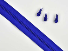 1 Meter endlos Reißverschluss mit 3 mm breiter Spirale in kobaltblau inkl. 3 farblich passender Schieber. Der Reißverschluss hat eine Gesamtbreite von 2,6 cm und ist nicht teilbar. Der Schiebergriff ist 1,3 cm lang und der ganze Schieber 1,6 cm.