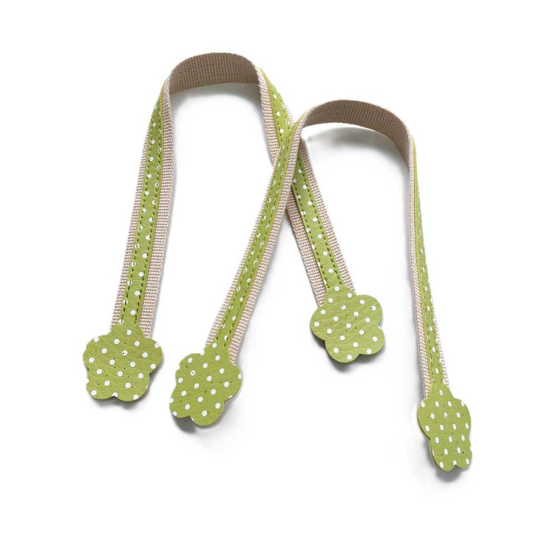 Naturfarbene Taschenhenkel aus Gurtband besetzt mit hellgrün weiß gepunktetem Kunstleder. Die Taschenhenkel sind 40 cm lang und müssen einfach nur angenäht werden.