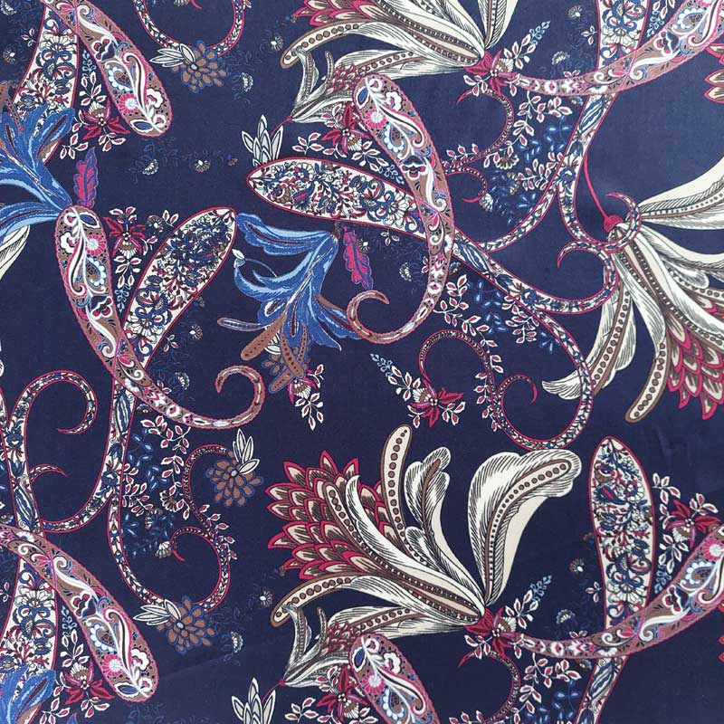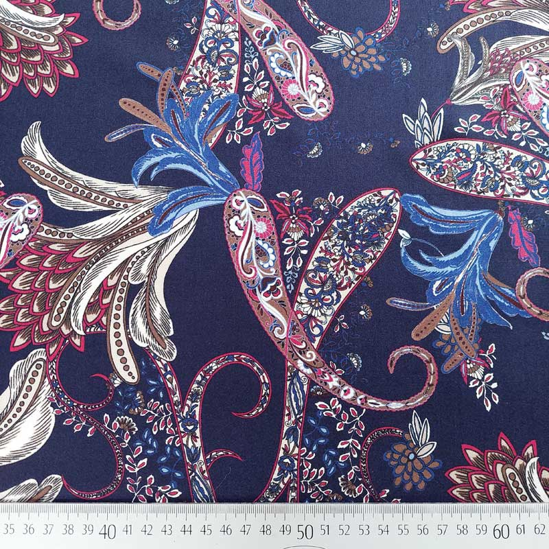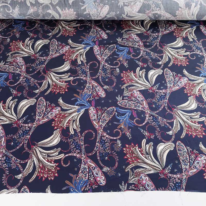 Der Viskose Satinstoff aus Italien hat eine sehr feine glatte Oberfläche, ist besonders weich und leicht. Wie für Satin üblich zeichnet sich der Stoff durch eine feine, seidig glänzende Oberfläche aus, was dem Stoff einen eleganten Charakter verleiht. Die feine Webware hat einen fließenden Fall und liegt angenehm weich und locker auf der Haut. Das italienische Design verleiht dem Stoff einen exquisiten Charakter und gibt dem fertigen Kleidungsstück einen eleganten, femininen Look. Die Farbkombination aus dunkelblau und weinrot ist edel und zeitlos.