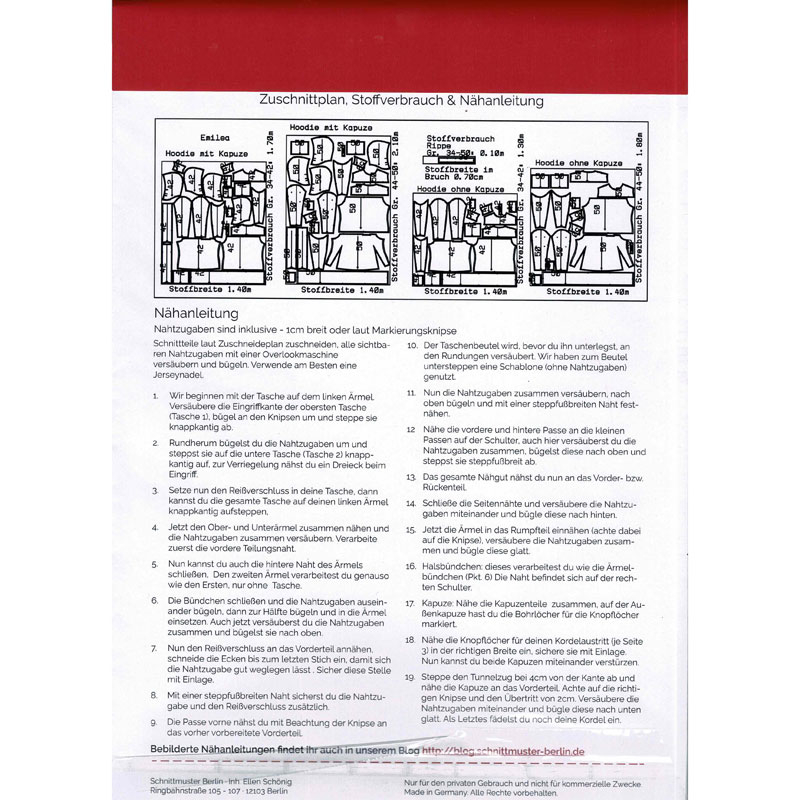 Dann ist dieser Hoodie genau richtig für Sie. Der Schnitt wurde zusammen mit der Berliner Bloggerin Emilea entwickelt. Er verkörpert Lässigkeit und Coolness durch die Details wie eingearbeiter Reißverschluss auf dem Vorderteil sowie der aufgesetzten Reißverschlusstasche auf dem Ärmel. Er kann mit Kapuze genäht werden oder mit Rundhals. Die Teilungsnähte am Vorder- und Rückenteil und die eingezogene Kordel sorgen für zusätzliche Rafinesse.