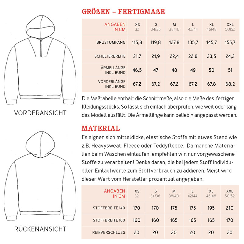FRAU YUTTA ist ein moderner Hoodie-Schnitt für alle, die lässige, komfortable Styles lieben. Der extra-oversized Schnitt mit überschnittenen Schultern sorgt für eine entspannte Passform, während die gedoppelte Kapuze und der praktische Zipper am Halsloch an den klassischen Troyer-Look erinnern. Bündchen an Ärmeln und Saum geben dem Hoodie Form und Komfort. Ein ideales Schnittmuster für gemütliche Alltagslooks – geeignet für fortgeschrittene Nähanfängerinnen.