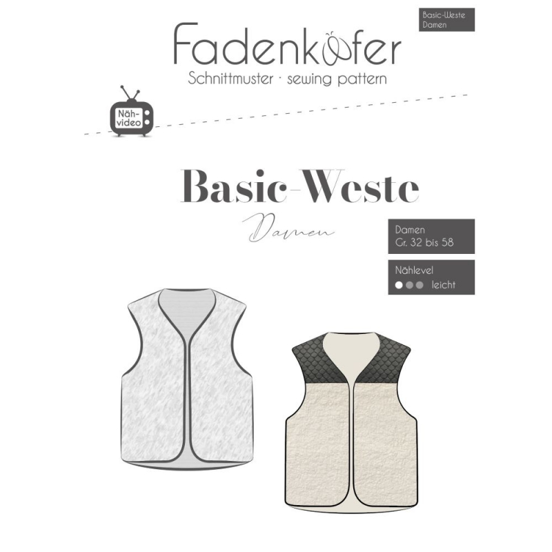 Mit dem Papierschnittmuster „Basic Weste Damen“ gestalten Sie Ihre individuelle Damenweste ganz einfach selbst. Ob sportlich, casual oder schick – die Weste lässt sich vielseitig kombinieren und anpassen.