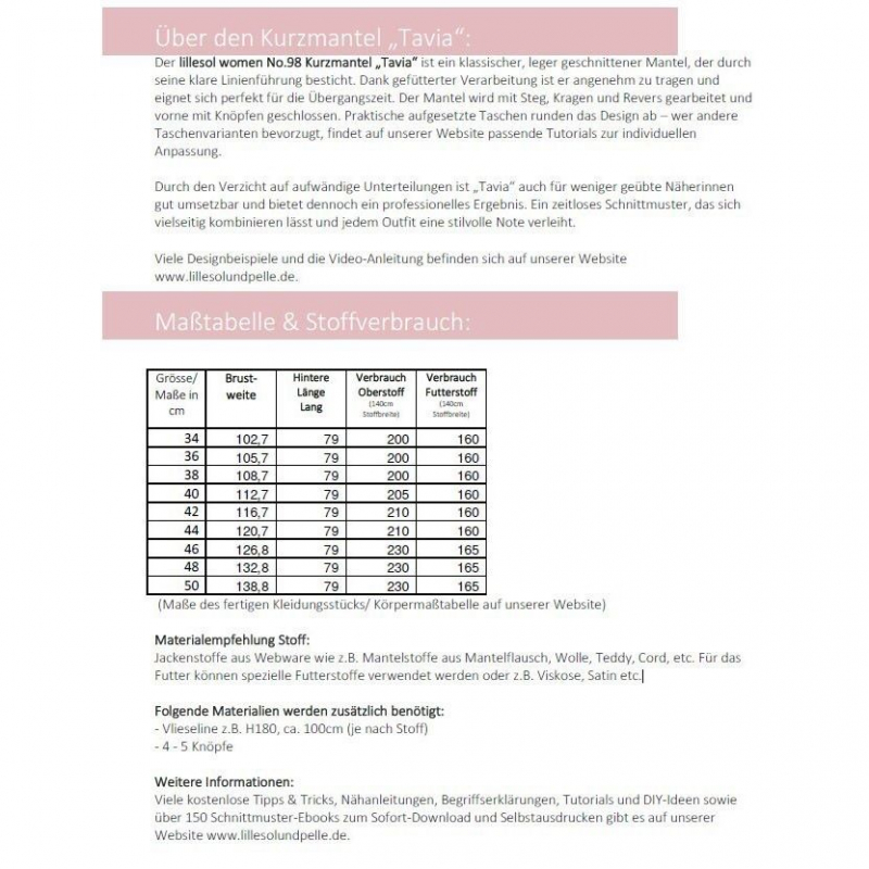 Durch den Verzicht auf aufwändige Unterteilungen ist „Tavia“ auch für weniger geübte Näherinnen gut umsetzbar und bietet dennoch ein professionelles Ergebnis. Ein zeitloses Schnittmuster, das sich vielseitig kombinieren lässt und jedem Outfit eine stilvolle Note verleiht.