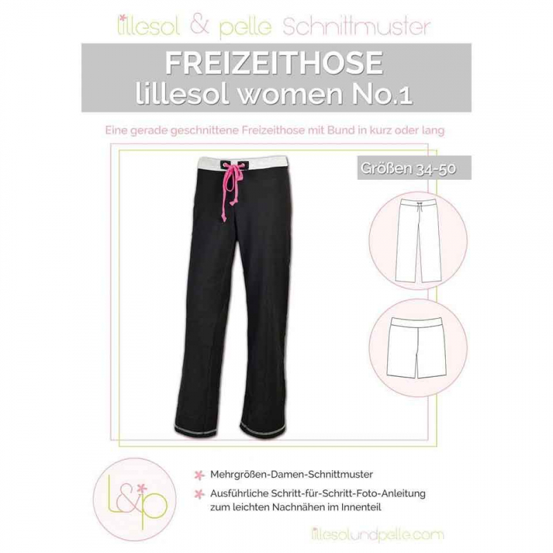 Die lillesol women No.1 Freizeithose ist eine leger geschnittene Hose mit geradem Bein, die aus dehnbaren Materialien wie Jersey genäht wird. Die Hose sitzt leicht hüftig. Die lillesol women No.1 Freizeithose lässt sich beliebig kürzen, so dass schnell eine kurze Hose oder eine Dreiviertelhose genäht ist.