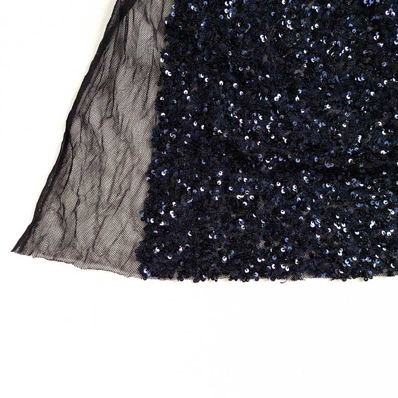 Ein schwarzer elastischer Netzstoff besetzt mit kleinen, changierenden marineblauen Pailletten. Je nach Lichteinfall variiert die Farbe der Pailletten. Der Paillettenstoff ist weich und sehr elastisch und bietet somit guten Tragekomfort. Der Stoff ist leicht transparent und die Stoffrückseite ist glatt.