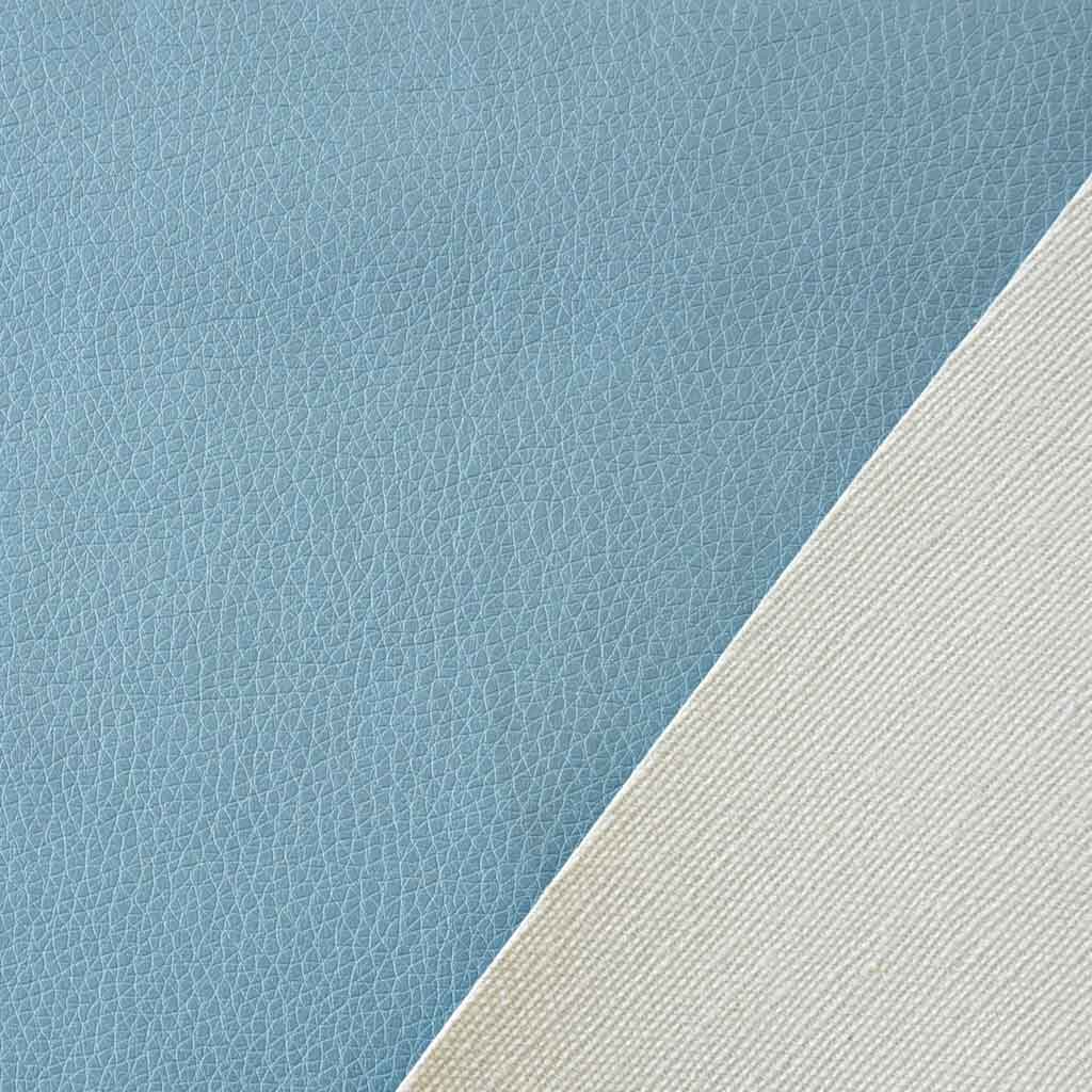 Es handelt sich um ein Reststück der Größe 50 cm (L) x 143 cm (B). Ein rauchblaues Kunstleder mit geprägter Optik. Die Rückseite besteht aus einem hellen Geweberücken aus Baumwolle. Das Lederimitat hat einen weichen Griff und wirkt dadurch wie Echtleder.
