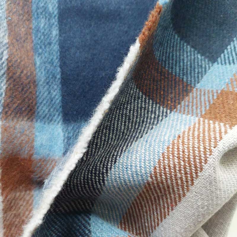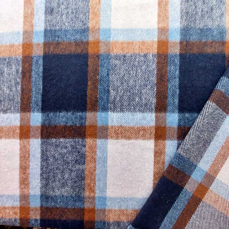 Ein flauschig weicher Mantelstoff mit Wollanteil mit braun dunkelblau weiß Karomuster. Der karierte Stoff hat eine wollige, weiche Oberfläche und hält ordentlich warm. Die Stoffrückseite ist glatt (nicht angeraut).