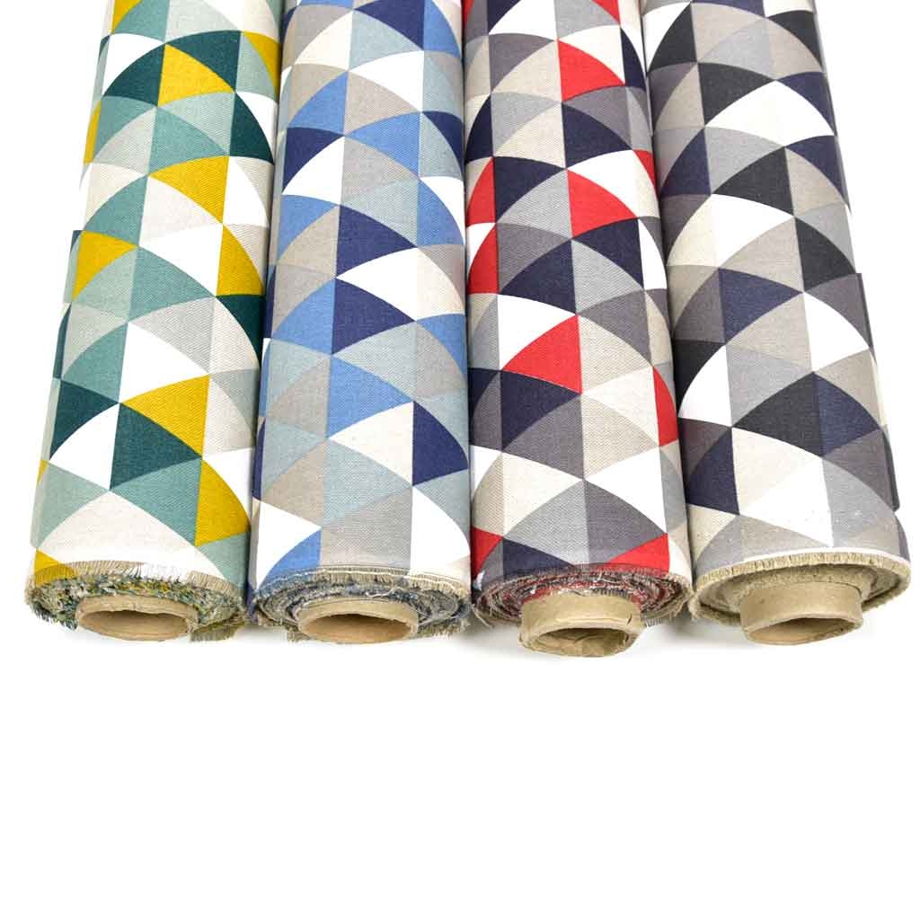 Ein naturfarbener Dekostoff in Leinen Optik bedruckt mit dunkelgrauen,hellgrauen, blaugrauen, taupefarbenen und weißen Dreiecken. Der Baumwollstoff hat einen festeren Griff und ist aufgrund des Polyesteranteils robust. Die Stoffrückseite ist unbedruckt und somit naturfarben (Leinenlook).