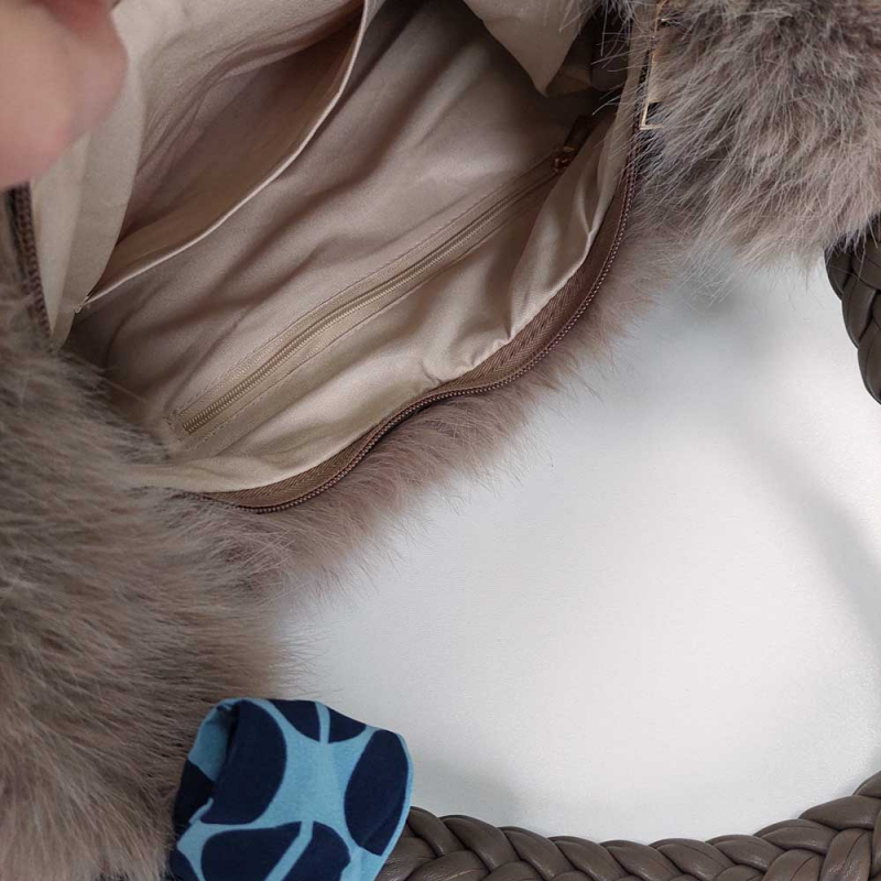 Diese Tasche vereint luxuriöse Optik mit praktischer Funktionalität. Das taupe Fellimitat sorgt für einen weichen, modernen Look, der jedes Outfit aufwertet. Das Fellimitat ist dicht,und extrem weich und flauschig. Der geflochten Griff aus Lederimitat ist ein wahrer Hingucker, das blaue Tuch (abnehmbar) fügt eine verspielte Note hinzu.