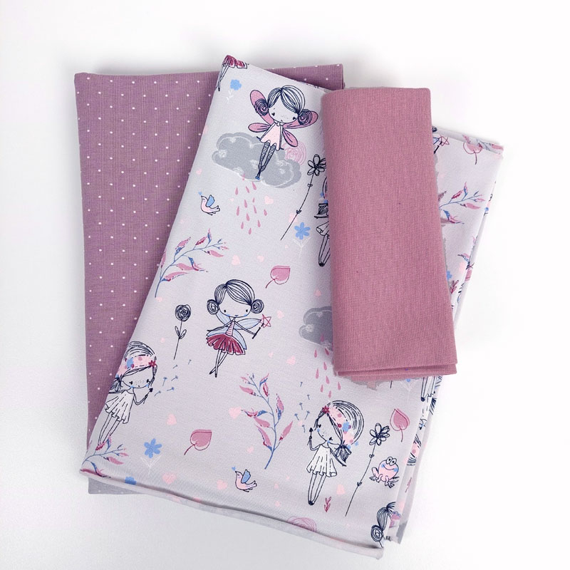Ein süßes Stoffpaket zur Herstellung von einzigartiger Baby-und Kinderkleidung. Die Farben altrosa und grau sehen wunderschön zusammen aus und ergeben eine harmonische Farbkombination. Die Stoffe sind weich und elastisch und liegen angenehm weich auf der Haut.