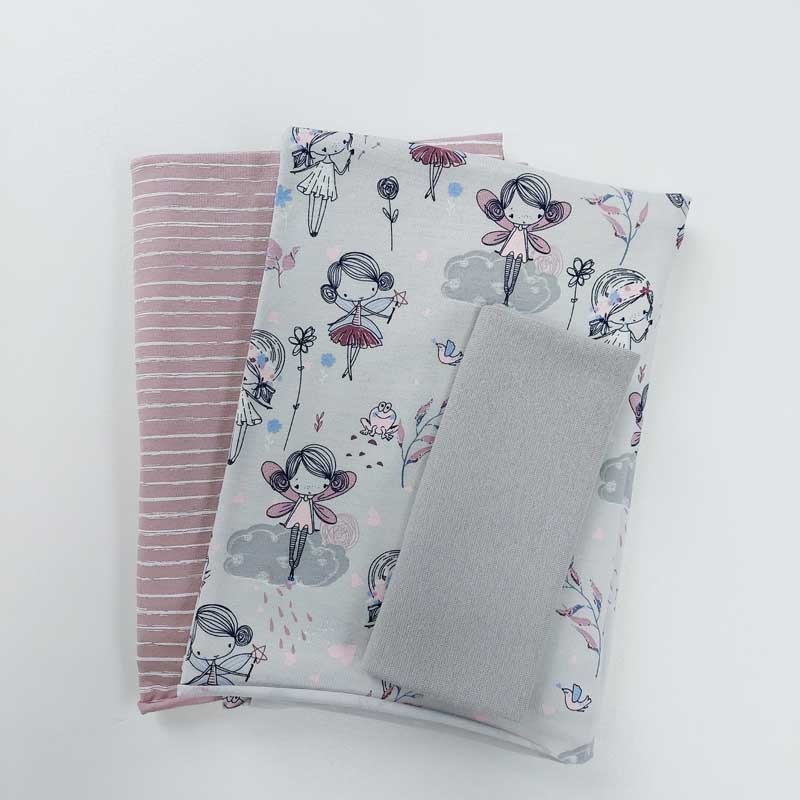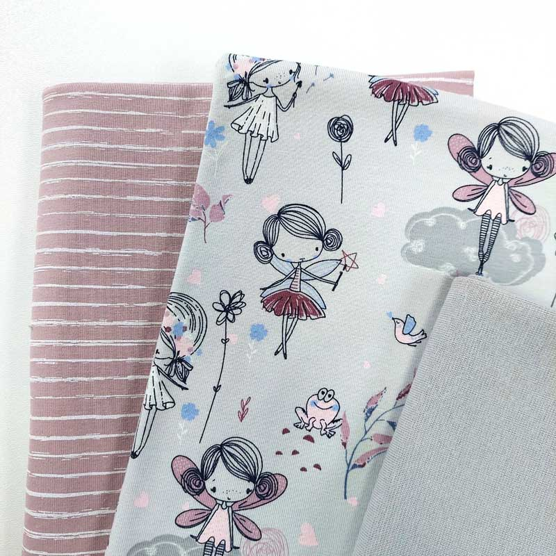 Ein süßes Stoffpaket zur Herstellung von einzigartiger Baby-und Kinderkleidung. Die Farben altrosa und grau sehen wunderschön zusammen aus und ergeben eine harmonische Farbkombination. Die Stoffe sind weich und elastisch und liegen angenehm weich auf der Haut.
