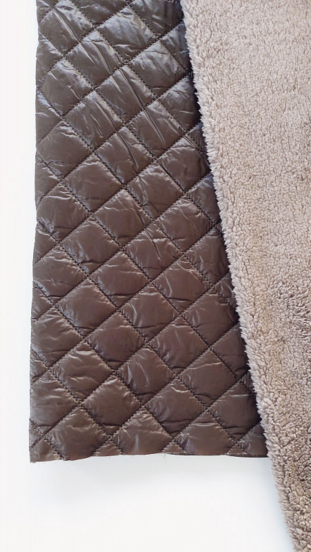 Ein schokobrauner (dunkelbrauner) Steppstoff, der aus 3 Lagen Stoff besteht, die in Rauten abgesteppt sind. Der Stoff ist leicht, weich im Griff und unelastisch. Die abgesteppten Rauten haben einen Durchmesser von 5 cm. Zwischen dem oberen und unteren Stoff liegt eine dünne Wattierung. Vorder- und Rückseite sehen gleich aus.