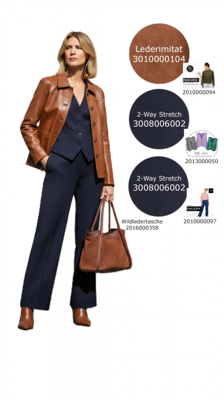 Styling: Nähen Sie sich daraus eine klassische Hose mit Bundfalten oder einen Bleistiftrock und kombinieren Sie dazu eine schicke weiße Hemdbluse aus Baumwollstoff oder eine Schluppenbluse aus Viskosesatin.