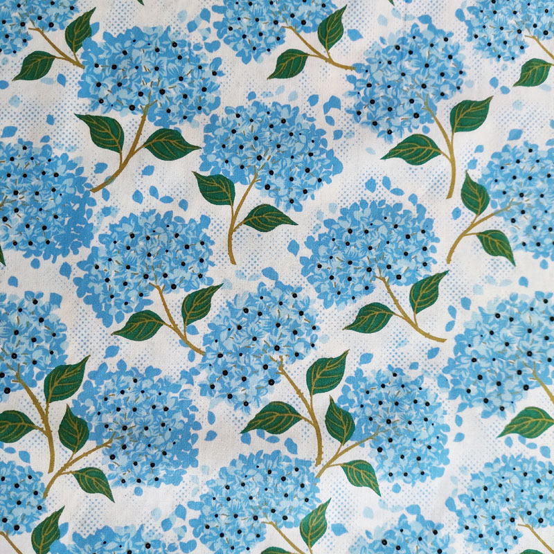Ein weißer Baumwollstoff digital bedruckt mit hellblauen Hortensien Blüten. Die leichte Webware hat eine glatte Oberfläche und ist unelastisch. die Stoffrückseite ist unbedruckt, d.h. weiß.