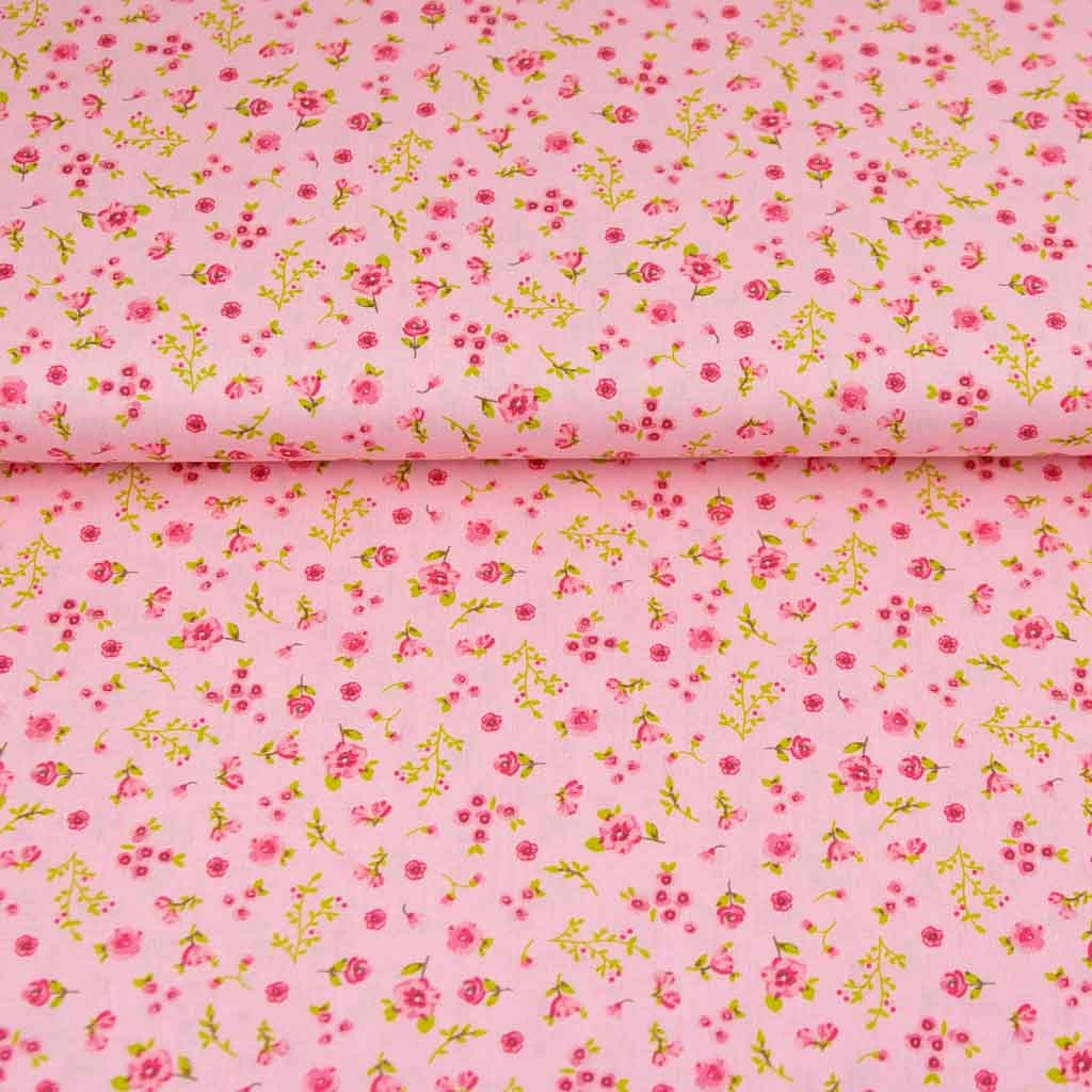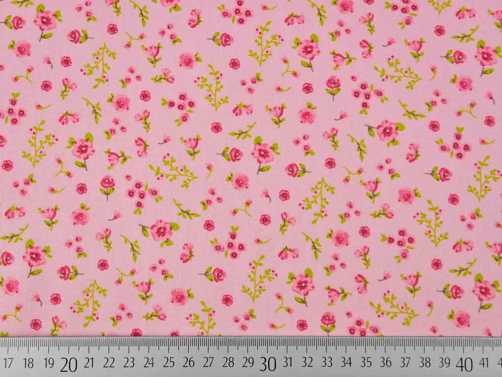 Ein rosa Baumwollstoff hergestellt aus biologisch erzeugten Naturfasern. Die rosa Webware ist mit dunkelrot-rosa Streublümchen und hellgrünen Stengeln und Blättern bedruckt. Die Bio-Baumwolle hat eine glatte Oberfläche, einen weichen Griff und ist unelastisch. Sie lässt sich auch von Nähanfängern gut vernähen.