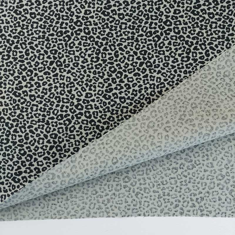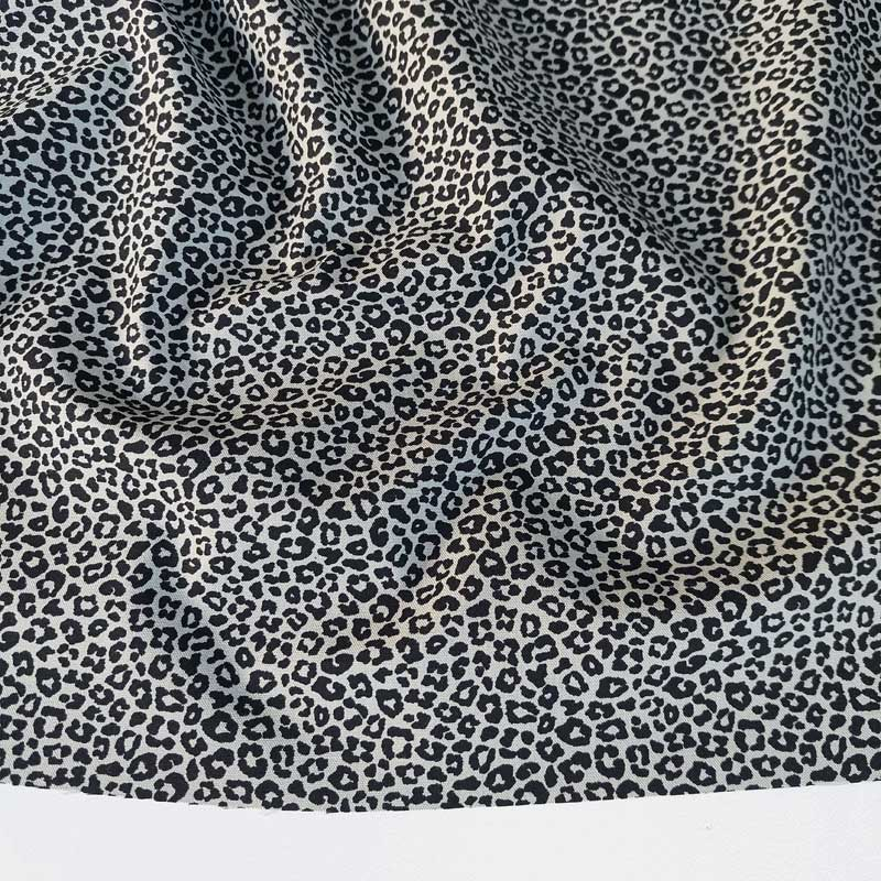 Ein khakigrüner Baumwollstoff bedruckt mit kleinem, schwarzen Leoparden Muster. Die Webware ist glatt und lässt sich auch von Nähanfängern gut vernähen. Die Stoffrückseite ist nicht bedruckt