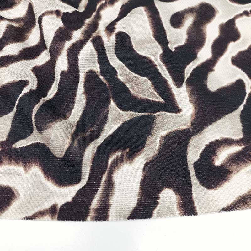 Ein beiger Canvas Stoff bedruckt mit dunkelbraunem Animal Print. Es handelt sich um einen Slub Stoff, d. h. das verwendet Garn ist unterschiedlich dick so dass sich eine interessante Struktur ergibt, was einen leichten Vintage Look kreiiert. Der Baumwollstoff ist robust, unelastisch und lässt sich gut vernähen. Die Stoffrückseite ist nicht bedruckt, d.h. weiß.