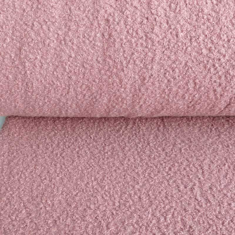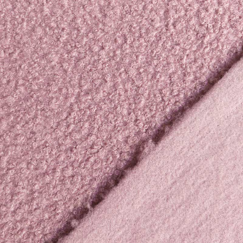 Ein elastischer, altrosa Boucle Stoff. Der Stoff hat einen weichen Griff und die "Löckchen" erinnern an Schafsfell. Die Stoffrückseite ist glatt.