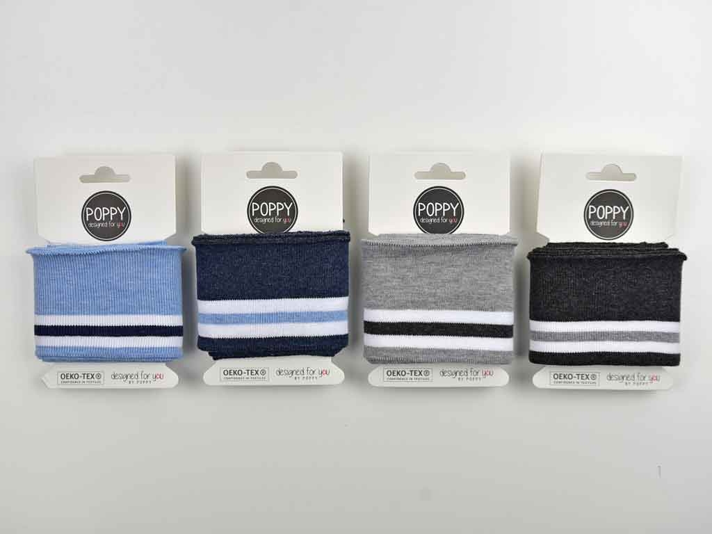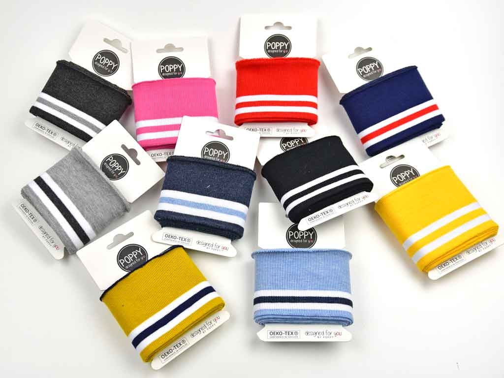 Aus der Poppy Kollektion ein dunkelgrau-meliertes Fertigbündchen im College Stil mit zwei weißen und einem hellgrauen Streifen. Das Bündchen hat eine fertige Kante und muss nur noch angenäht werden.