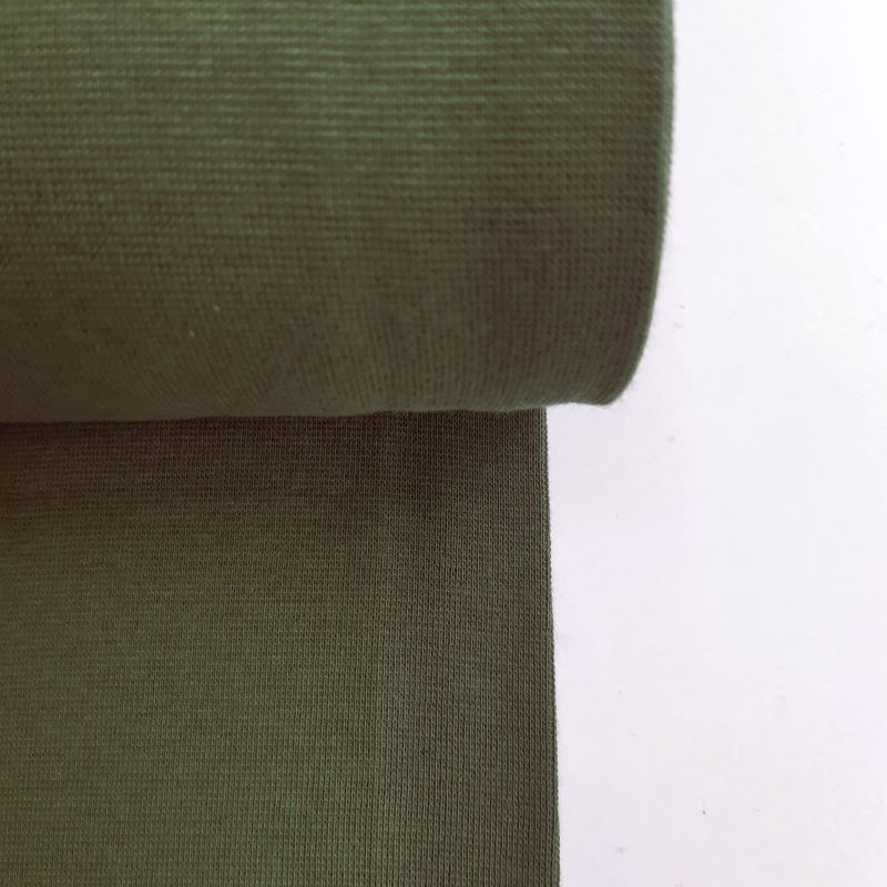 Ein khaki grüner Bündchenstoff im Glattstrick.