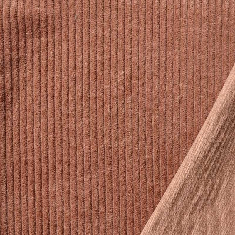 Ein cognac-brauner Breitcord Stoff in schöner Qualität. Mit 280 g/m2 ein schwererer Breitcordstoff. Der Stoff ist weich und hat einen für Cord üblichen Strich. Die einzelnen Rippen sind 5 mm breit.