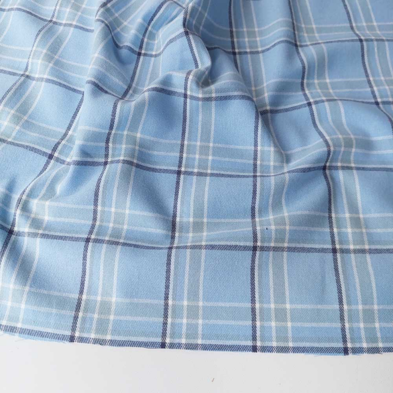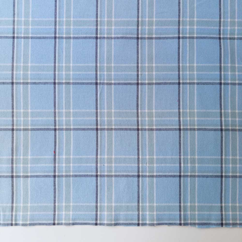 Ein hellblauer leicht angerauter Flanellstoff mit dunkelblau, mint cremeweißem Karomuster. Der karierte Baumwollstoff hat eine leicht flauschige Oberfläche, ist unelastisch und lässt sich gut vernähen. Das Karomuster ist in den Stoff gewebt, d.h. Vorder- und Rückseite sehen gleich aus.