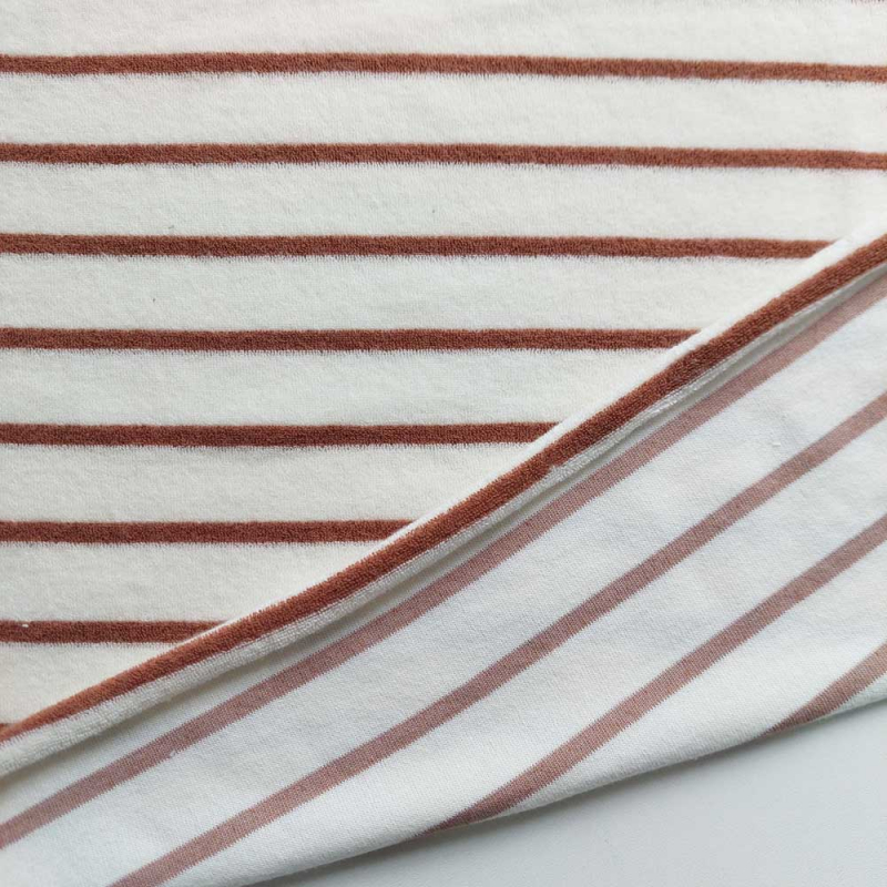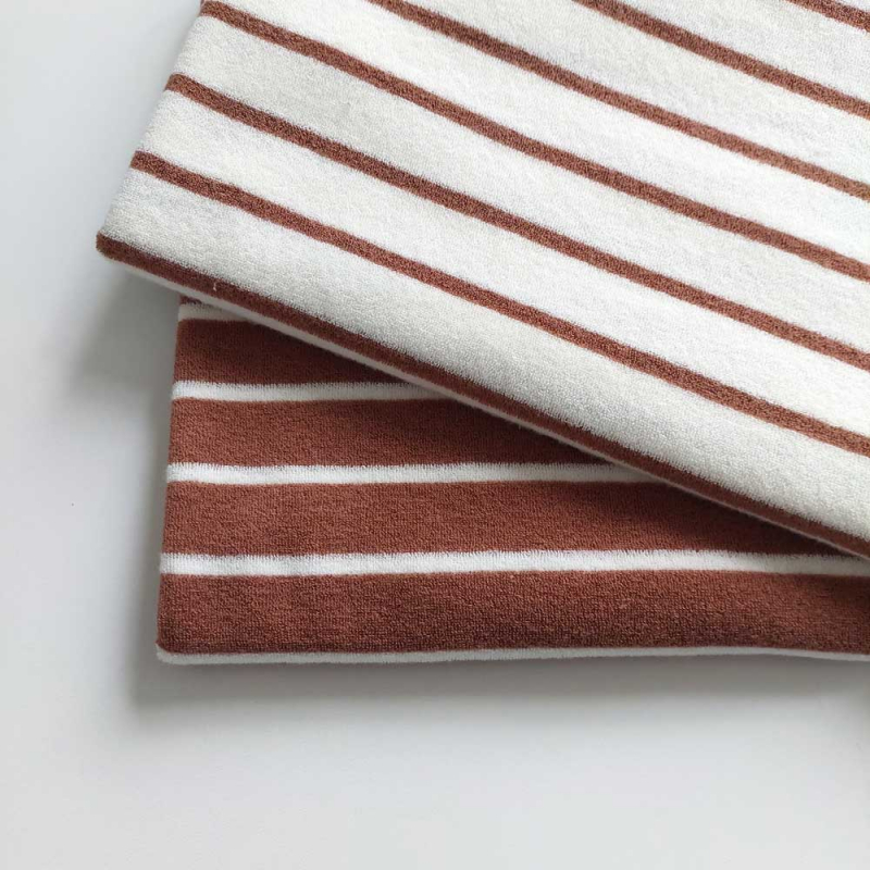 Unser Sweat Frottee Stoff mit schmalen Streifen kombiniert die kuschelige Weichheit von Frottee mit der angenehmen Dehnbarkeit von Sweatstoff. Der Stoff ist besonders saugfähig, atmungsaktiv und hautfreundlich, wodurch er sich ideal für bequeme Kleidung eignet. Dank seiner elastischen Eigenschaften ist er perfekt für Hoodies, Jogginghosen, Pullover, Babybekleidung, Bademäntel und Freizeitmode. Die feine Streifenoptik verleiht jedem Nähprojekt eine zeitlose Eleganz. Ob für gemütliche Loungewear oder stylische Homewear – dieser hochwertige Sweat Frottee sorgt für maximalen Tragekomfort und ein angenehmes Hautgefühl.