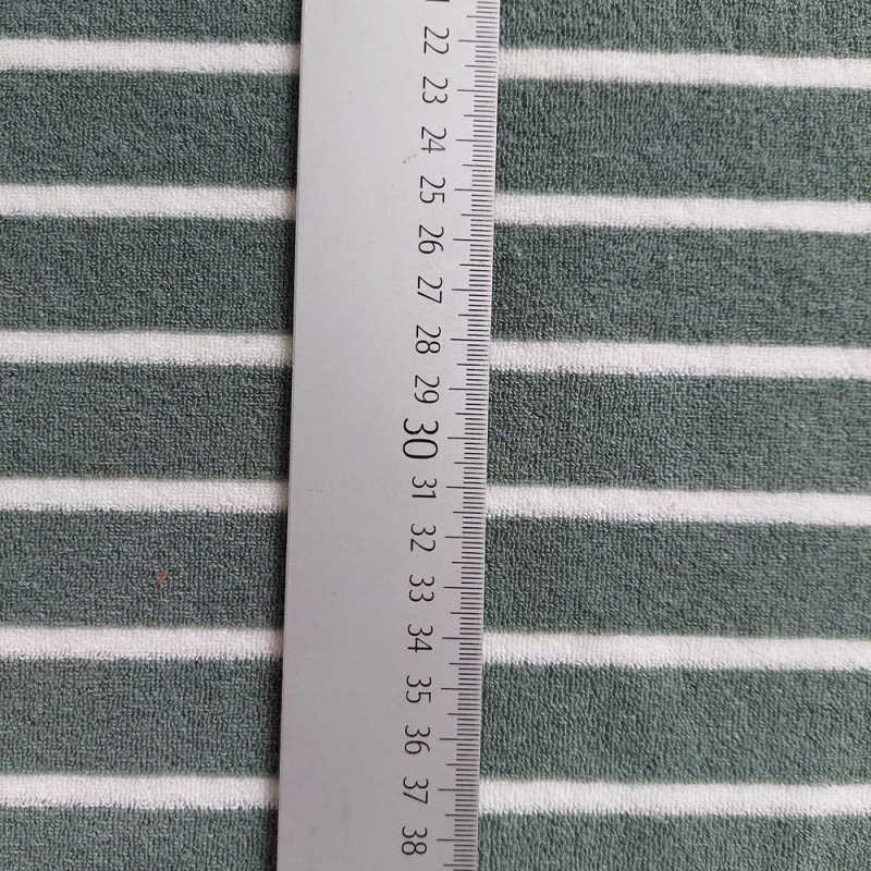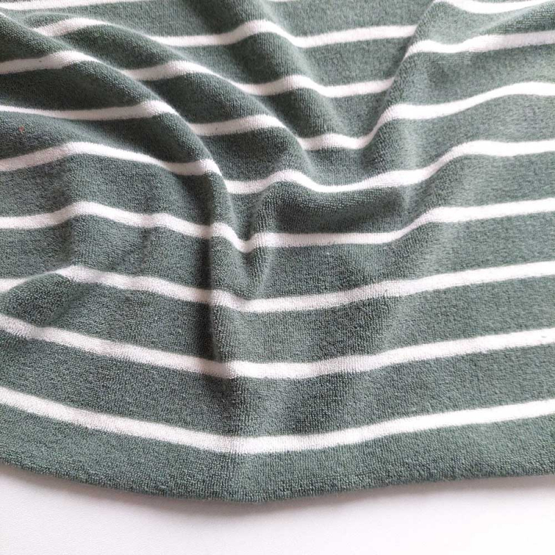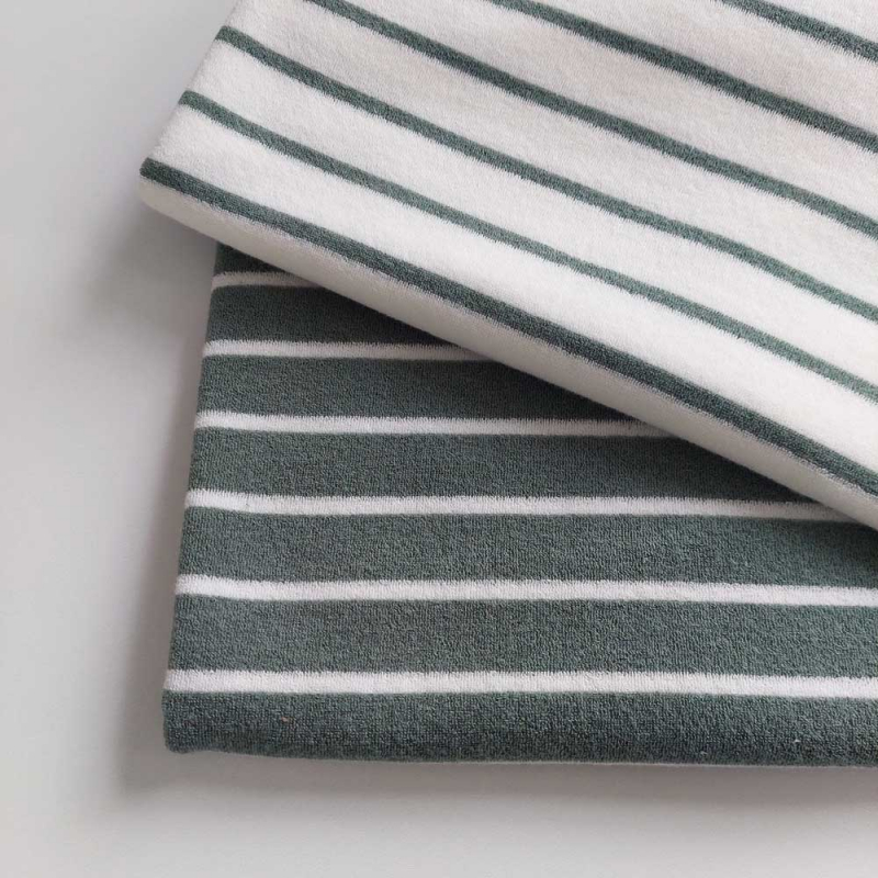 Unser Sweat Frottee Stoff mit schmalen Streifen kombiniert die kuschelige Weichheit von Frottee mit der angenehmen Dehnbarkeit von Sweatstoff. Der Stoff ist besonders saugfähig, atmungsaktiv und hautfreundlich, wodurch er sich ideal für bequeme Kleidung eignet. Dank seiner elastischen Eigenschaften ist er perfekt für Hoodies, Jogginghosen, Pullover, Babybekleidung, Bademäntel und Freizeitmode. Die feine Streifenoptik verleiht jedem Nähprojekt eine zeitlose Note. Ob für gemütliche Loungewear oder stylische Homewear – dieser hochwertige Sweat Frottee sorgt für maximalen Tragekomfort und ein angenehmes Hautgefühl.
