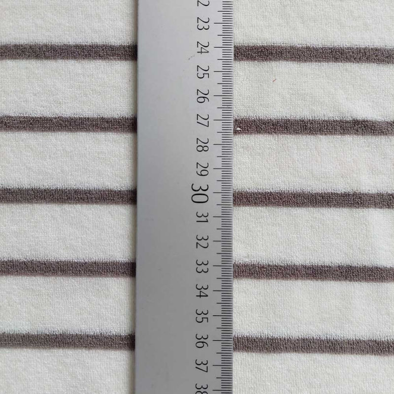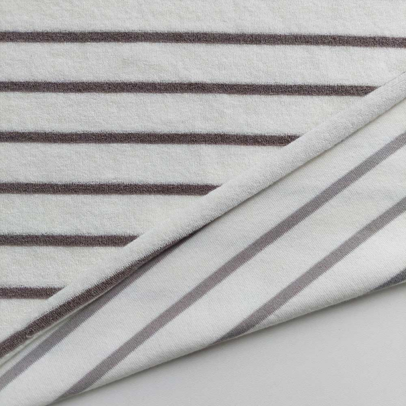 Unser Sweat Frottee Stoff mit schmalen Streifen kombiniert die kuschelige Weichheit von Frottee mit der angenehmen Dehnbarkeit von Sweatstoff. Der Stoff ist besonders saugfähig, atmungsaktiv und hautfreundlich, wodurch er sich ideal für bequeme Kleidung eignet. Dank seiner elastischen Eigenschaften ist er perfekt für Hoodies, Jogginghosen, Pullover, Babybekleidung, Bademäntel und Freizeitmode. Die feine Streifenoptik verleiht jedem Nähprojekt eine zeitlose Eleganz. Ob für gemütliche Loungewear oder stylische Homewear – dieser hochwertige Sweat Frottee sorgt für maximalen Tragekomfort und ein angenehmes Hautgefühl.
