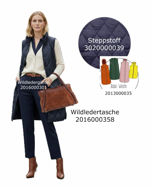 Der Stoff kann aber ebenso gut als Aussenstoff für leichte Jacken, Mäntel und Westen verwendet werden. In diesem Fall ist ein zusätzlicher Stoff als Futter notwendig, da die Stoffrückseite die Wattierung zeigt.
