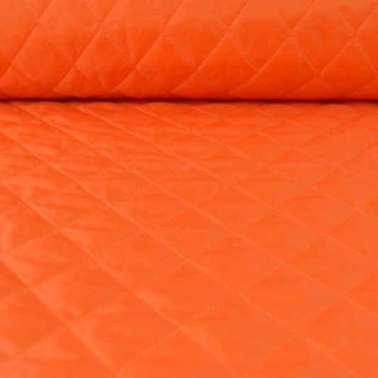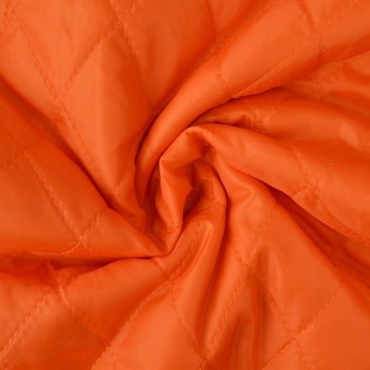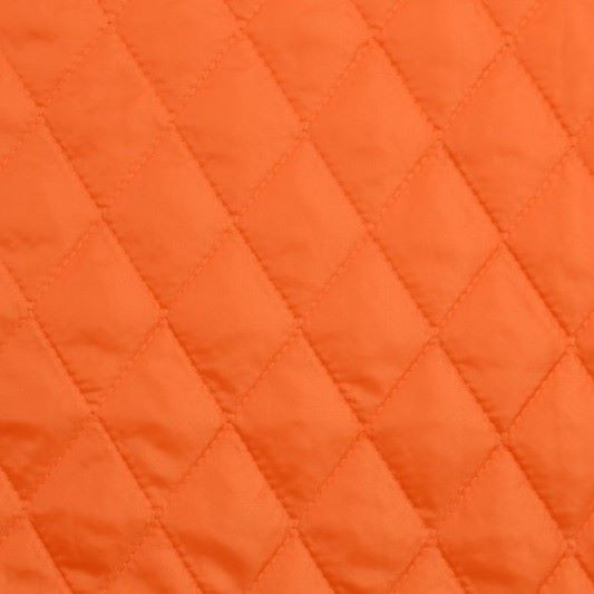 Ein orangener Steppstoff mit einer leichten Wattierung unterlegt und in Rauten abgesteppt. Die Oberfläche ist glatt und matt.