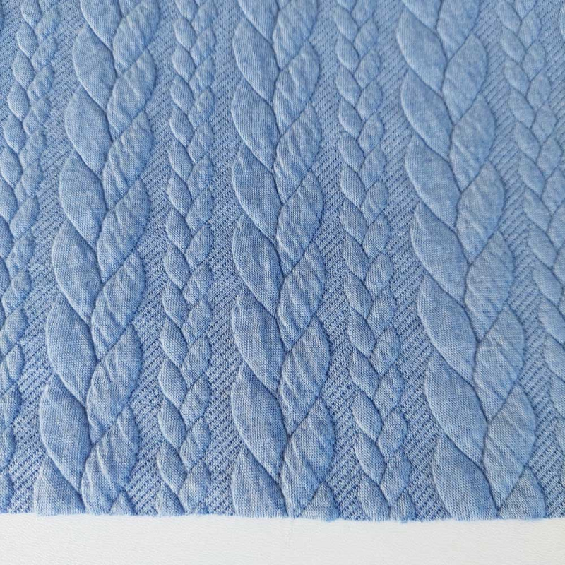 Ein weicher, hellblauer (bléu) Jacquard Jerseystoff mit klassischem Zopfmuster. Der Stoff ist elastisch und dehnt sich leicht.